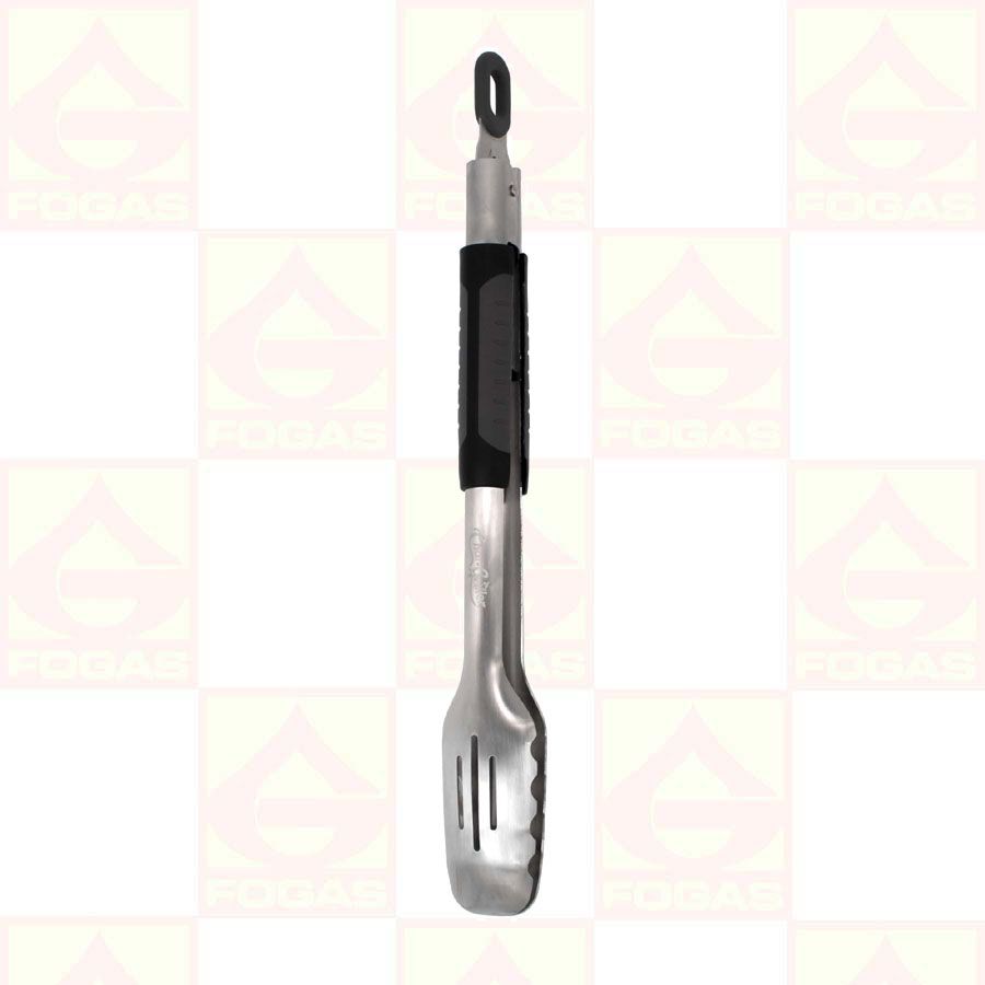 Fjäderbelastad för enkel användning, du kan lyfta, vända, flippa och transportera allt kött, grönsaker och mer med Char-Griller Spring Loaded Tongs. Tången är tillverkad i rostfritt stål och har ett gummibelagt handtag för ett halkfritt grepp och värmeskydd samt en låsbar krok för enkel förvaring.